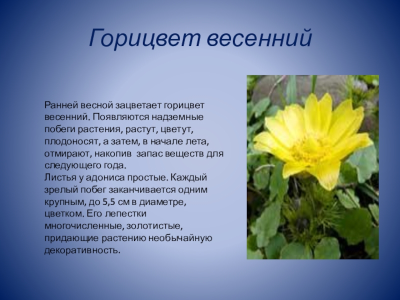 Ранней весной зацветает горицвет весенний. Появляются надземные побеги растения, растут,