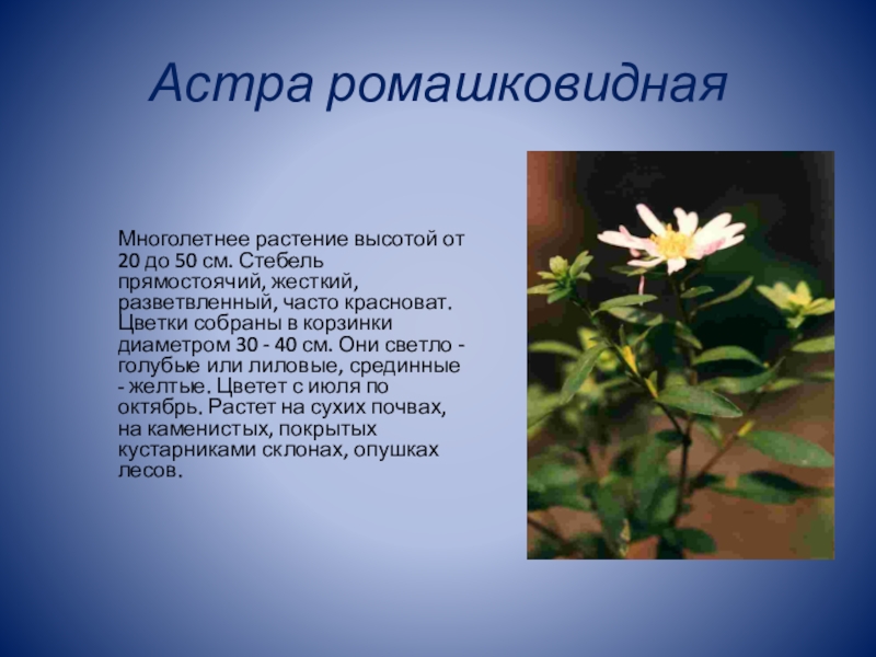 жесткий, разветвленный, часто красноват. Цветки собраны в корзинки диаметром 30 - 40 см. Они светло - голубые или лиловые, срединные - желтые. Цветет с июля по октябрь. Растет на сухих почвах, на каменистых, покрытых кустарниками склонах, опушках лесов.