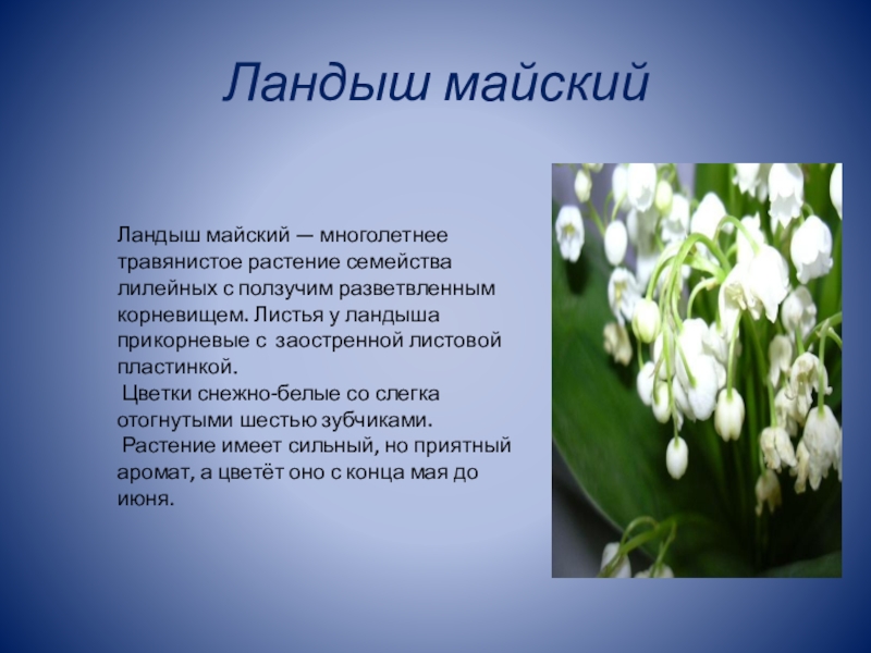 Ландыш майский — многолетнее травянистое растение семейства лилейных с ползучим