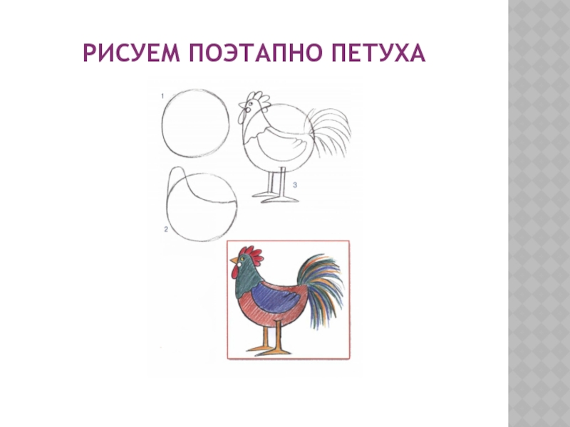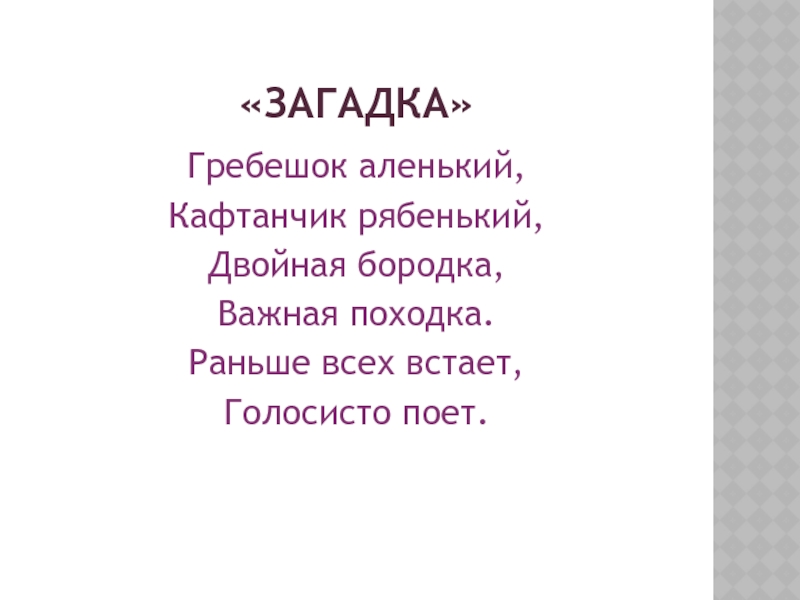 «Загадка»Гребешок аленький,Кафтанчик рябенький,Двойная бородка,Важная походка.Раньше всех встает,Голосисто поет.