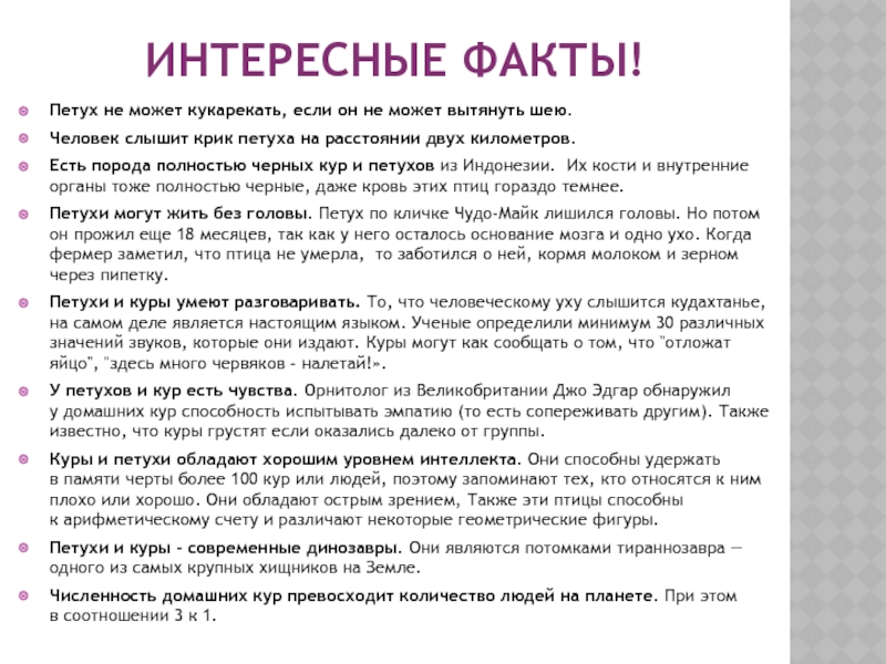 Интересные факты!Петух не может кукарекать, если он не может вытянуть шею. Человек слышит крик петуха на расстоянии двух