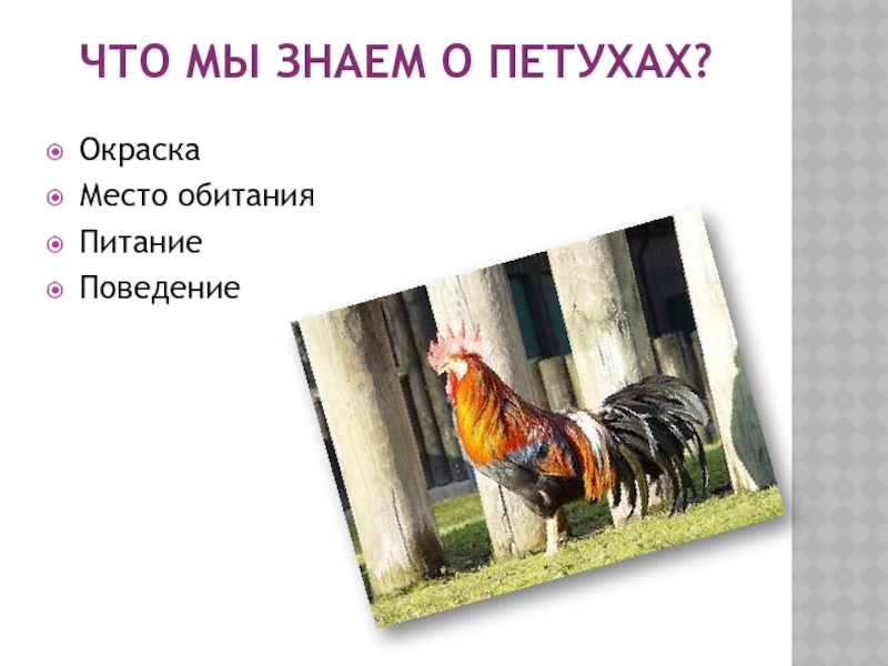 Что мы знаем о петухах?ОкраскаМесто обитанияПитаниеПоведение