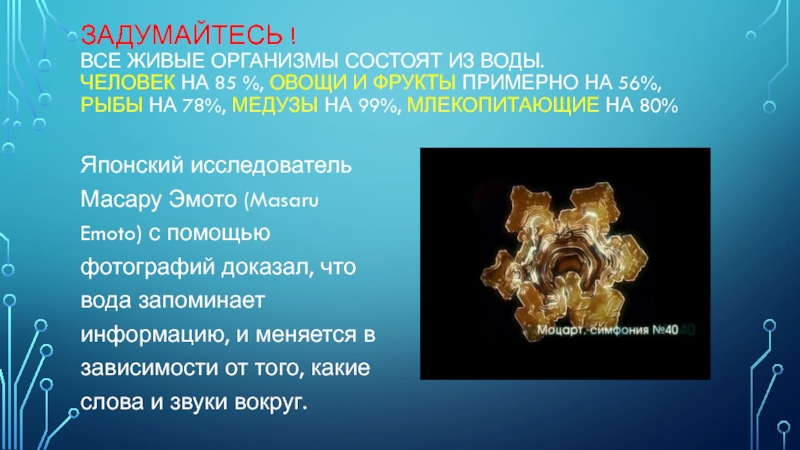 Японский исследователь Масару Эмото (Masaru Emoto) с помощью фотографий доказал, что вода запоминает информацию, и меняется в зависимости от того, какие слова и звуки вокруг.