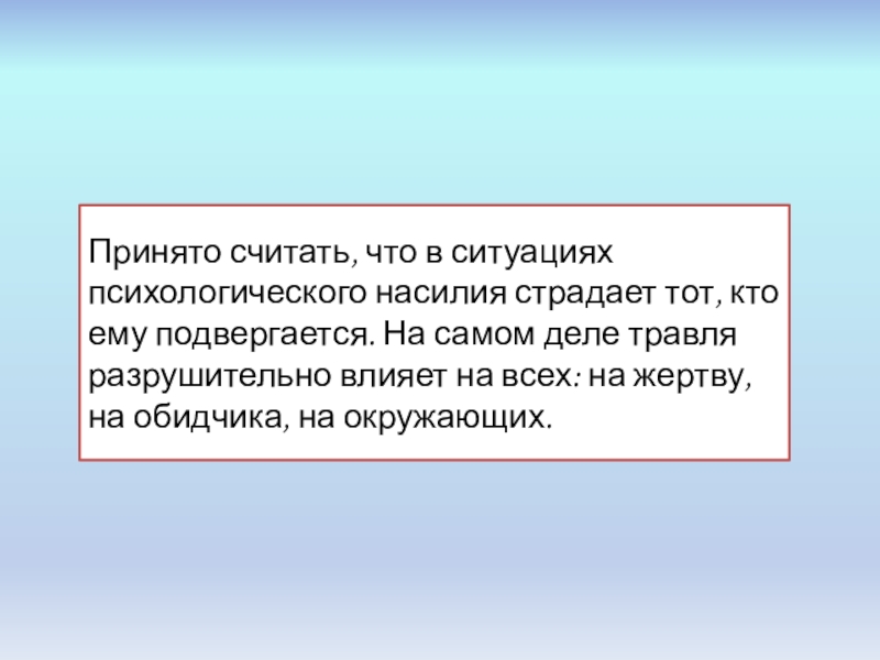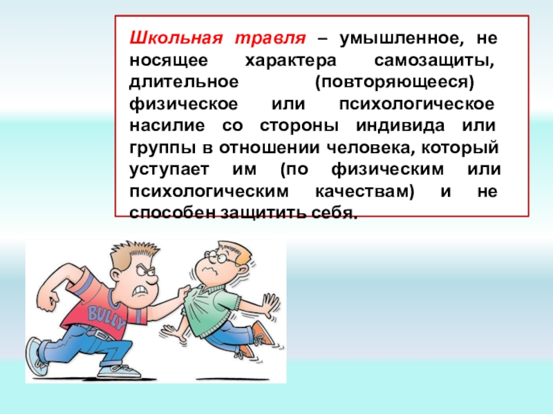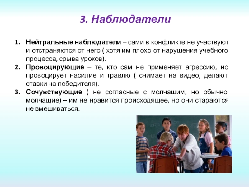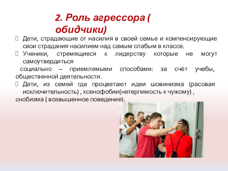 2. Социальное исключение – бойкот, отторжение, изоляция, отказ от общения с жертвой (с подростком отказываются играть, заниматься, не хотят с ним сидеть за одной партой).