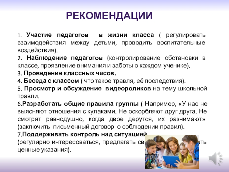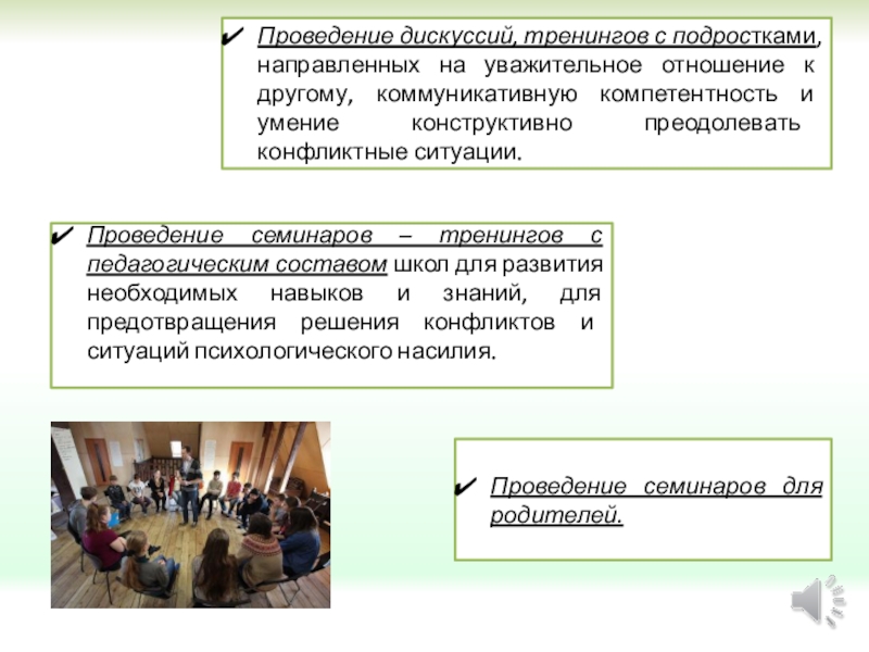 Проведение семинаров – тренингов с педагогическим составом школ для развития необходимых навыков и знаний, для предотвращения решения конфликтов и ситуаций психологического насилия.