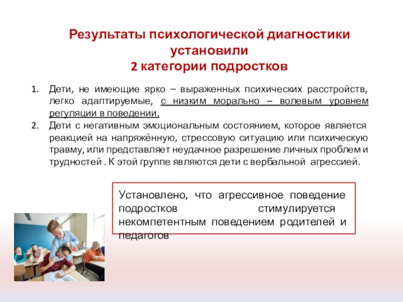 Установлено, что агрессивное поведение подростков стимулируется некомпетентным поведением родителей и педагогов