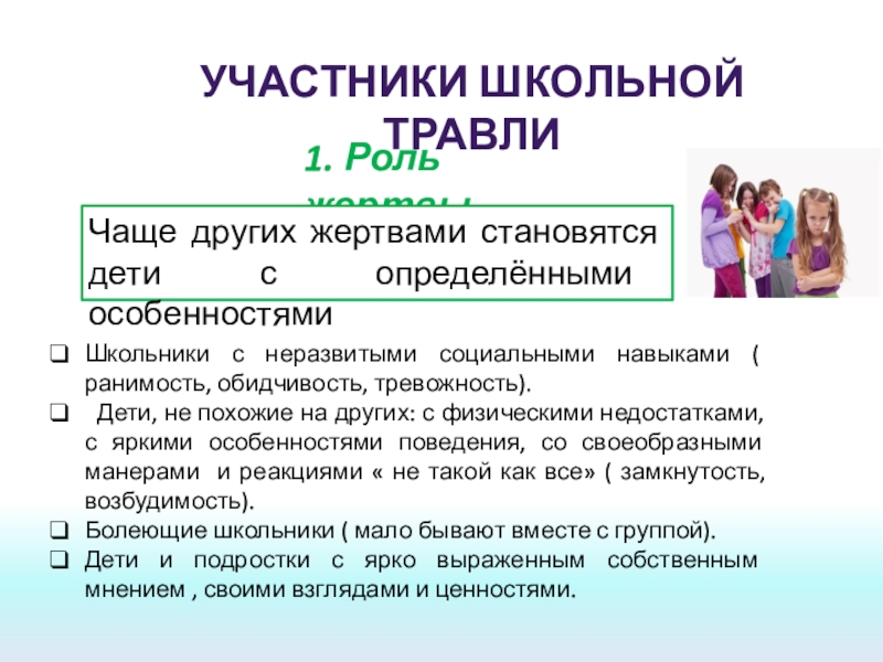 Дети, не похожие на других: с физическими недостатками, с яркими особенностями поведения, со своеобразными манерами и реакциями « не такой как все» ( замкнутость, возбудимость).