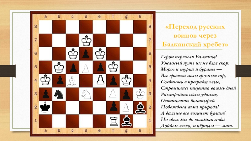 был скор:  Мороз и турки и бураны —  Все вражьи силы грозных гор,  Соединясь в преграды злые,  Стремились тщетно восемь дней Расстроить силы удалые,  Остановить богатырей.  Побеждена сама природа!  А дальше все возьмет булат!  Но здесь мы до восьмого хода Дойдем легко, и чёрным — мат.
