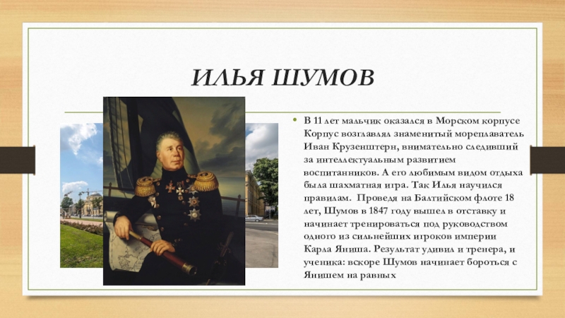 ИЛЬЯ ШУМОВВ 11 лет мальчик оказался в Морском корпусе Корпус возглавлял знаменитый мореплаватель Иван Крузенштерн, внимательно следивший