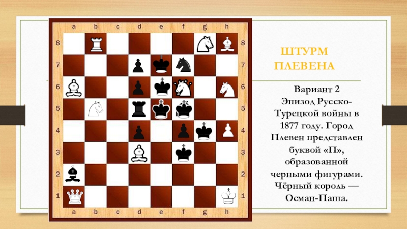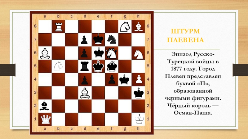 ШТУРМ ПЛЕВЕНАЭпизод Русско-Турецкой войны в 1877 году. Город Плевен представлен буквой «П», образованной черными фигурами. Чёрный король —