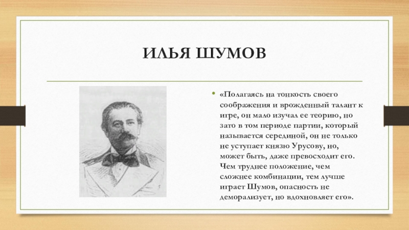 ИЛЬЯ ШУМОВ«Полагаясь на тонкость своего соображения и врожденный талант к игре, он мало изучал ее теорию, но