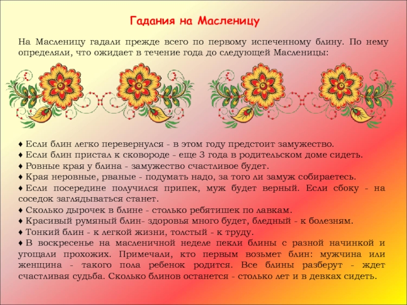 На Масленицу гадали прежде всего по первому испеченному блину. По нему определяли, что ожидает в течение года до следующей Масленицы: