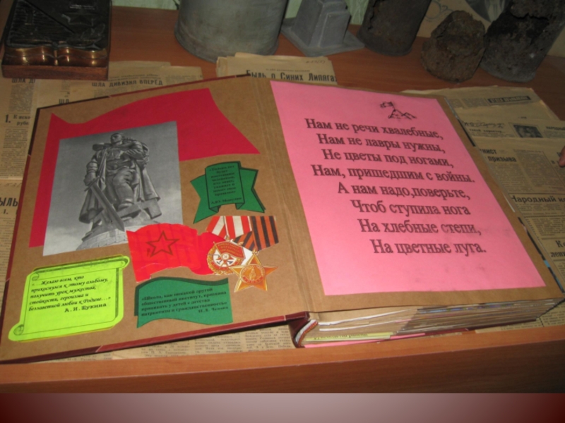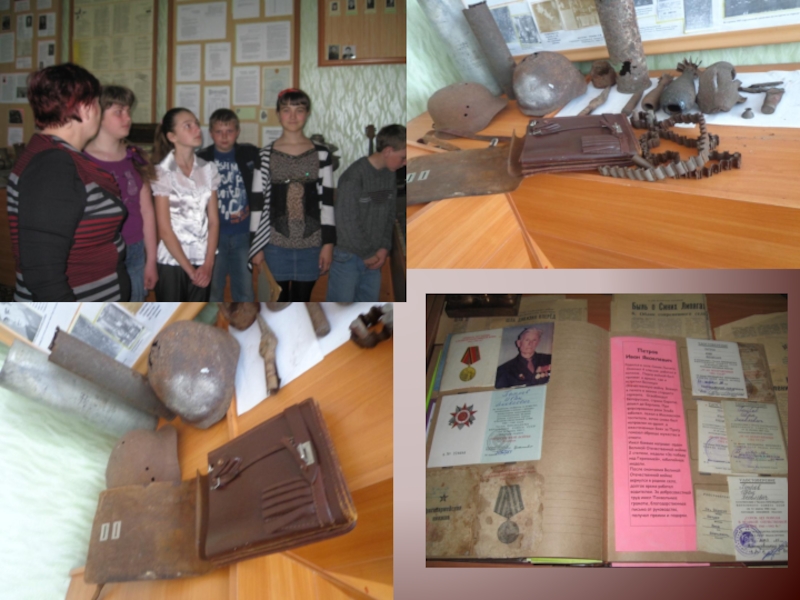 говорить очень много. Много красочных стендов, о которых мы не рассказали. Это: «Гордость нашей школы- медалисты», народное прикладное искусство наших земляков, многочисленные альбомы, разработки, рефераты, исследовательские работы. . Создан Совет музея, в который входят: педагоги, учащиеся со 2 по 11 класс, ведется документация по инвентаризации музея, в гости к школьникам приглашаются ветераны войны и труда, вдовы, ветераны педагогического труда, дети войны, простые труженики села. О них, трудовых династиях нашего села, созданы альбомы, фотовыставки. Работа продолжается, как никогда, она нужна сегодня для патриотического воспитания учащихся, воспитания у них любви к родине, малой Родине. Чем больше мы будем знать и любить историю нашего края, тем крепче будет наша Россия.