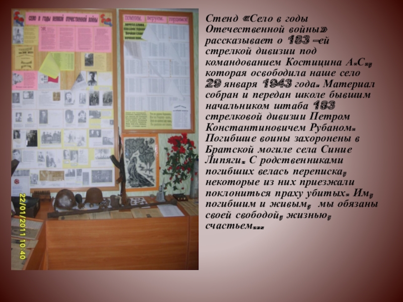 Слайд 6Стенд «Село в годы Отечественной войны» рассказывает о 183 –ей стрелкой