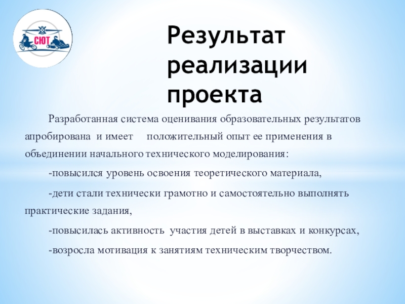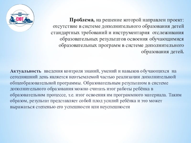 Актуальность введения контроля знаний, умений и навыков обучающихся на сегодняшний день является неотъемлемой частью реализации дополнительной общеобразовательной программы. Образовательным результатом в системе дополнительного образования можно считать итог работы ребёнка в образовательном процессе, т.е. итог освоения им программного материала. Таким образом, результат представляет собой плод усилий ребёнка и это может выражаться степенью его успешности или неуспешности