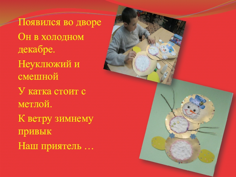 Появился во дворе Он в холодном декабре. Неуклюжий и смешной У катка стоит с метлой. К ветру