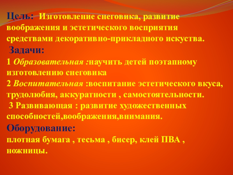 Цель: Изготовление снеговика, развитие воображения и эстетического восприятия средствами декоративно-прикладного искуства. Задачи: 1 Образовательная :научить детей поэтапному изготовлению снеговика 2 Воспитательная :воспитание эстетического вкуса, трудолюбия, аккуратности , самостоятельности. 3 Развивающая : развитие художественных способностей,воображения,внимания.
