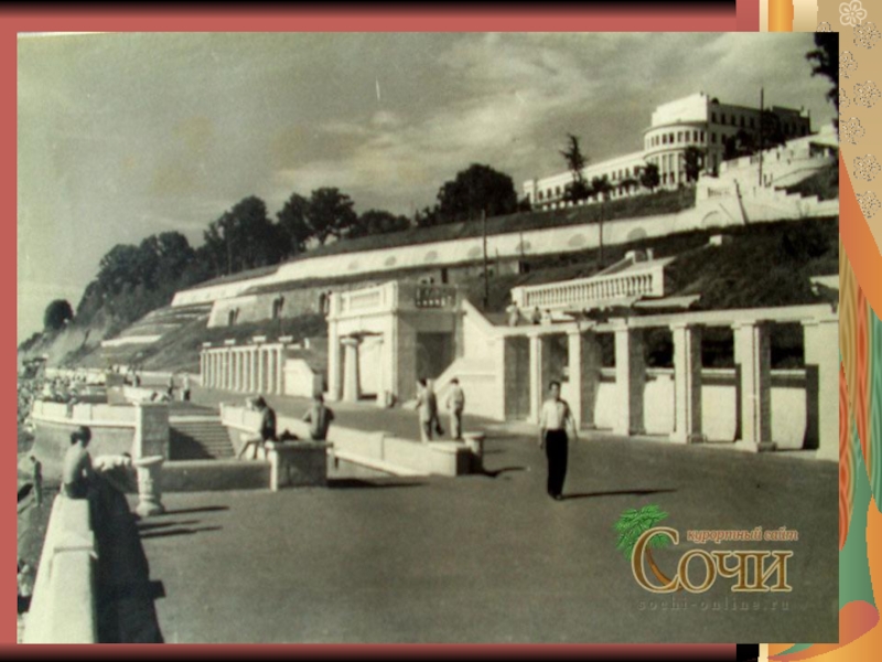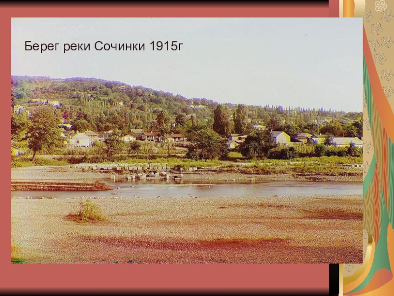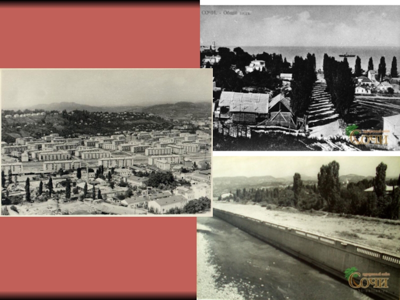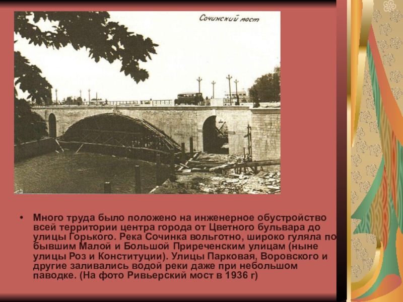 от Цветного бульвара до улицы Горького. Река Сочинка вольготно, широко гуляла по бывшим Малой и Большой Приреченским улицам (ныне улицы Роз и Конституции). Улицы Парковая, Воровского и другие заливались водой реки даже при небольшом паводке. (На фото Ривьерский мост в 1936 г)