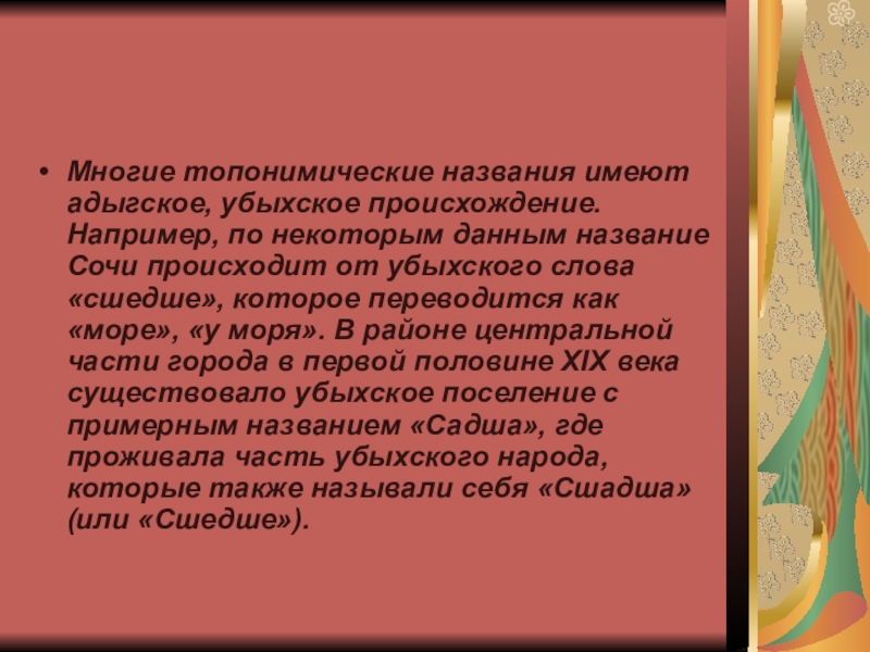 Слайд 21Многие топонимические названия имеют адыгское, убыхское происхождение. Например, по некоторым данным