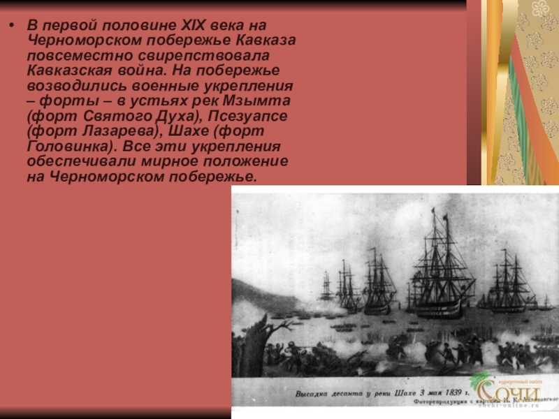 Кавказская война. На побережье возводились военные укрепления – форты – в устьях рек Мзымта (форт Святого Духа), Псезуапсе (форт Лазарева), Шахе (форт Головинка). Все эти укрепления обеспечивали мирное положение на Черноморском побережье.