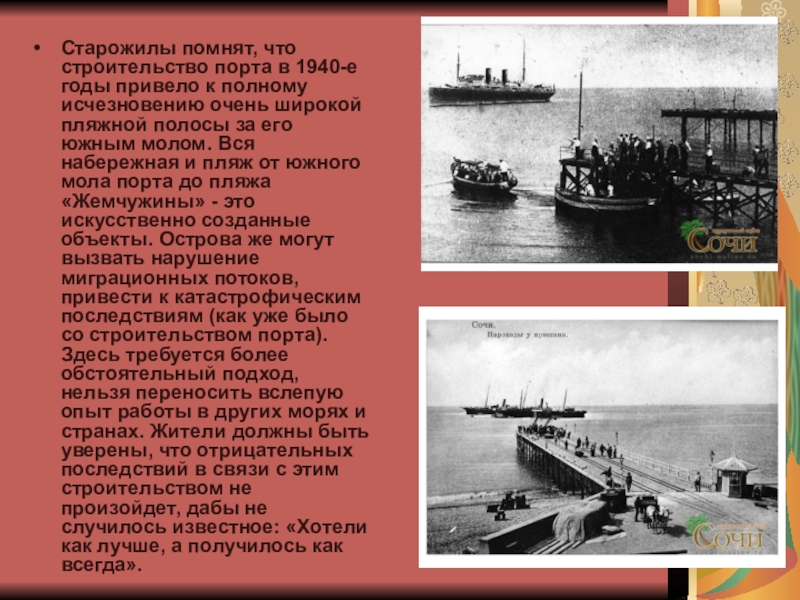 исчезновению очень широкой пляжной полосы за его южным молом. Вся набережная и пляж от южного мола порта до пляжа «Жемчужины» - это искусственно созданные объекты. Острова же могут вызвать нарушение миграционных потоков, привести к катастрофическим последствиям (как уже было со строительством порта). Здесь требуется более обстоятельный подход, нельзя переносить вслепую опыт работы в других морях и странах. Жители должны быть уверены, что отрицательных последствий в связи с этим строительством не произойдет, дабы не случилось известное: «Хотели как лучше, а получилось как всегда».