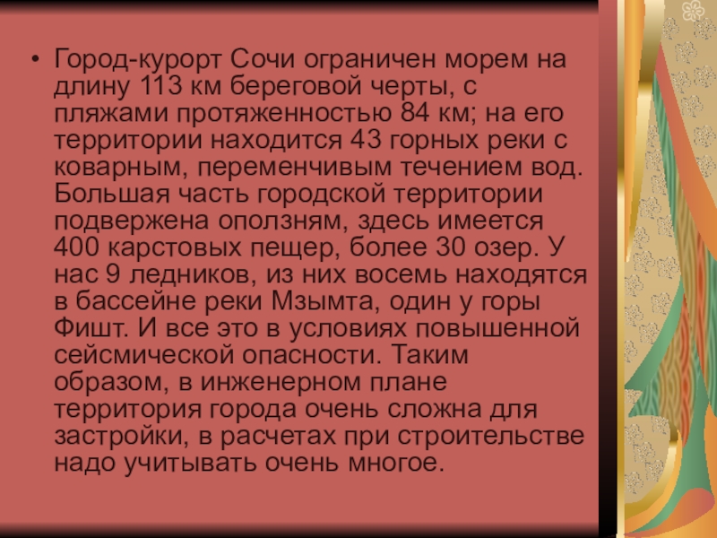 пляжами протяженностью 84 км; на его территории находится 43 горных реки с коварным, переменчивым течением вод. Большая часть городской территории подвержена оползням, здесь имеется 400 карстовых пещер, более 30 озер. У нас 9 ледников, из них восемь находятся в бассейне реки Мзымта, один у горы Фишт. И все это в условиях повышенной сейсмической опасности. Таким образом, в инженерном плане территория города очень сложна для застройки, в расчетах при строительстве надо учитывать очень многое.