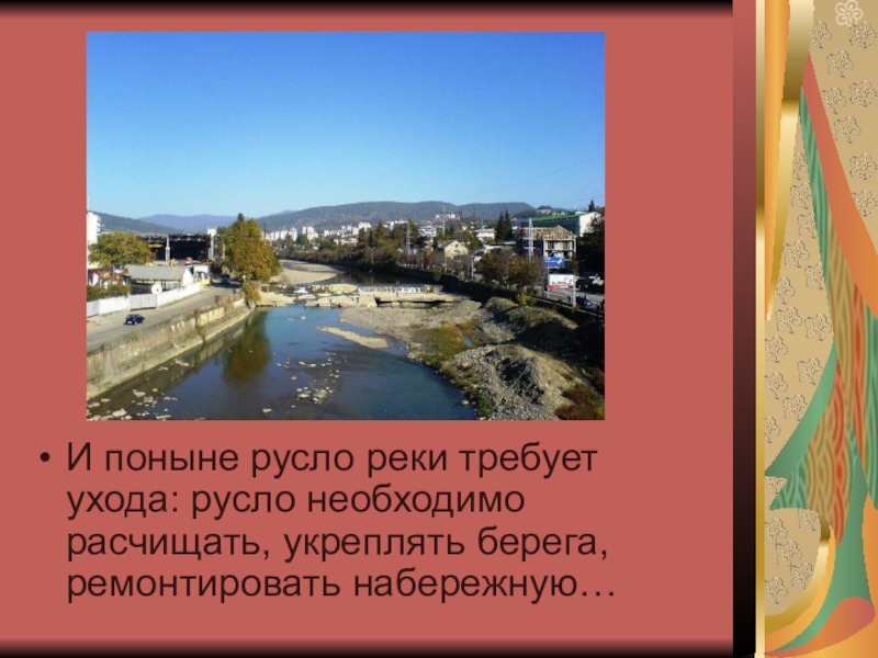 Слайд 20И поныне русло реки требует ухода: русло необходимо расчищать, укреплять берега,
