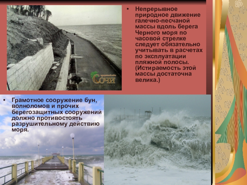 Слайд 6Грамотное сооружение бун, волноломов и прочих берегозащитных сооружений должно противостоять разрушительному