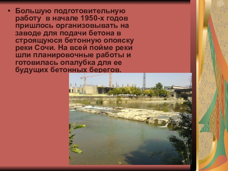 для подачи бетона в строящуюся бетонную опояску реки Сочи. На всей пойме реки шли планировочные работы и готовилась опалубка для ее будущих бетонных берегов.