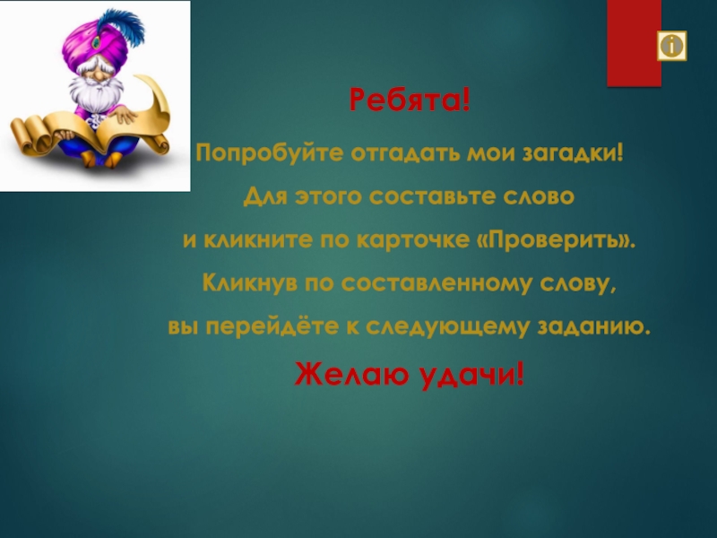 Ребята!Попробуйте отгадать мои загадки! Для этого составьте слово и кликните по карточке «Проверить». Кликнув по составленному слову, вы перейдёте к следующему заданию. Желаю удачи!