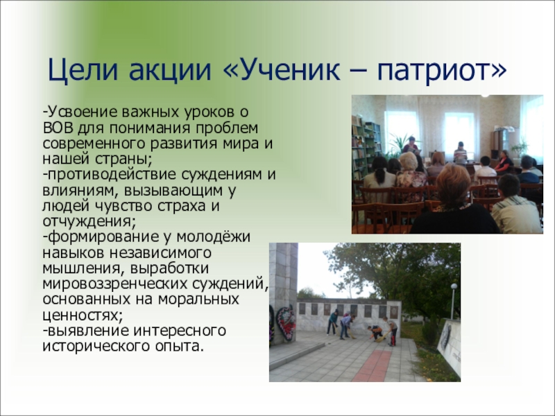– фронтовиках, участниках боевых действий, уборка территории у памятников)