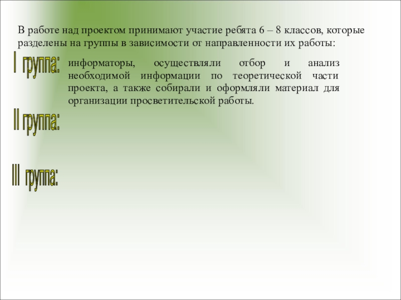 информаторы, осуществляли отбор и анализ необходимой информации по теоретической части проекта, а также собирали и оформляли материал для организации просветительской работы.