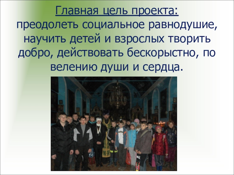преодолеть социальное равнодушие, научить детей и взрослых творить добро,