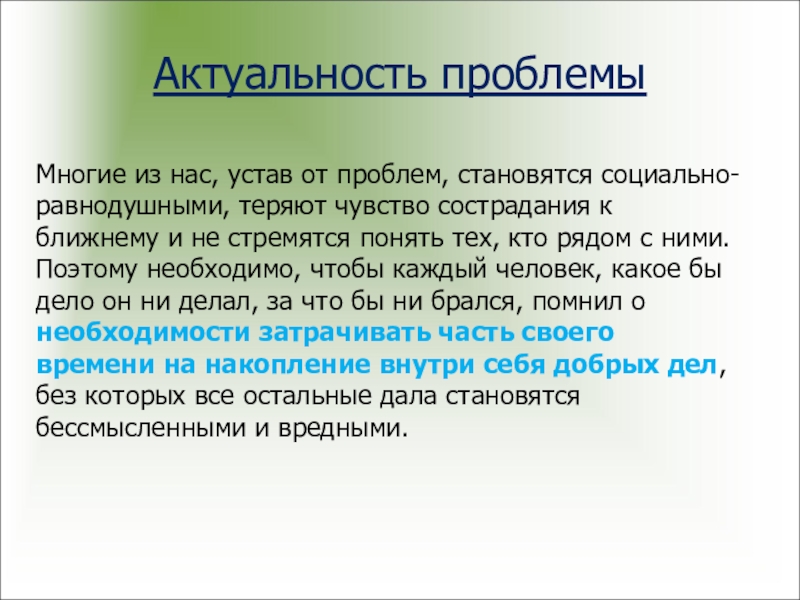чувство сострадания к ближнему и не стремятся понять тех, кто рядом с ними. Поэтому необходимо, чтобы каждый человек, какое бы дело он ни делал, за что бы ни брался, помнил о необходимости затрачивать часть своего времени на накопление внутри себя добрых дел, без которых все остальные дала становятся бессмысленными и вредными.