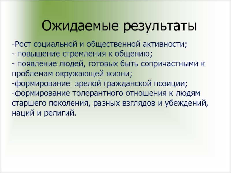 -формирование толерантного отношения к людям старшего поколения, разных взглядов и убеждений, наций и религий.