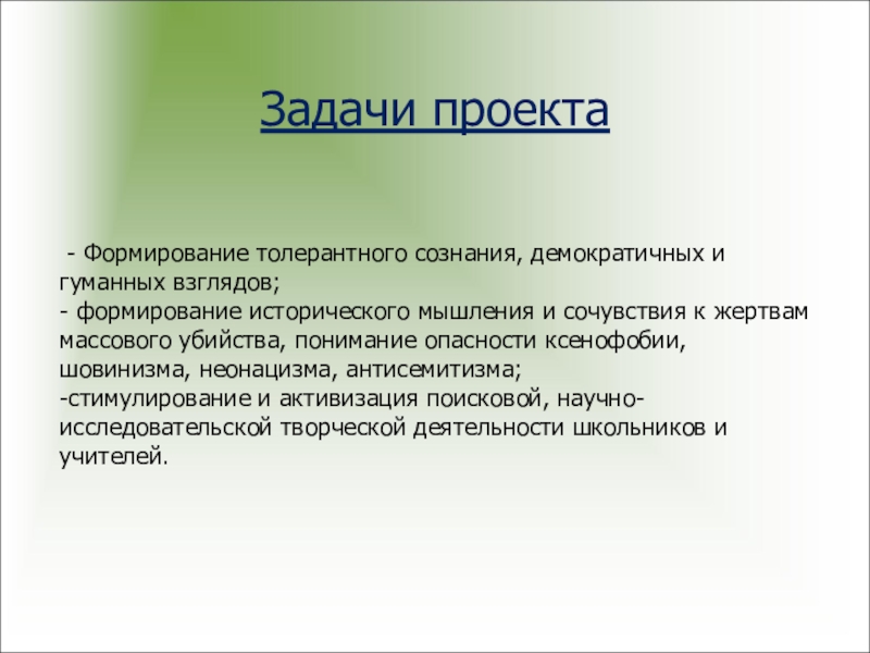 исторического мышления и сочувствия к жертвам массового убийства, понимание опасности ксенофобии, шовинизма, неонацизма, антисемитизма;
