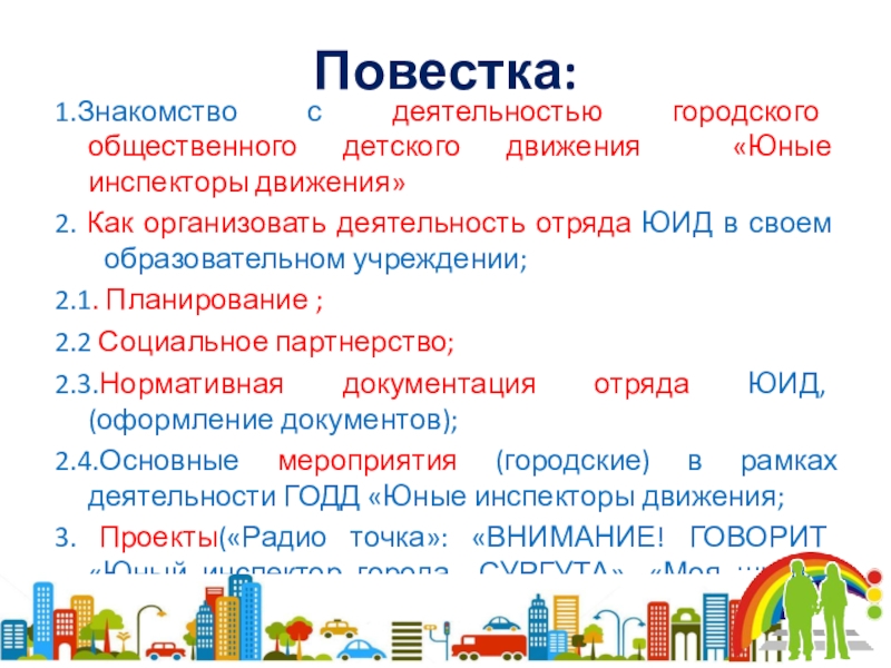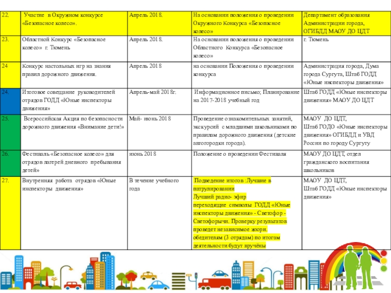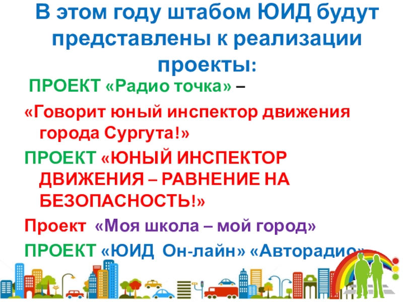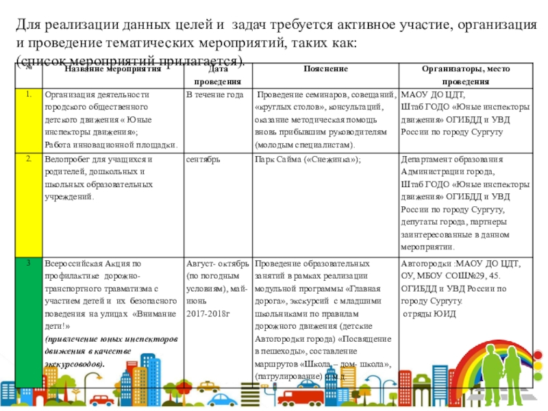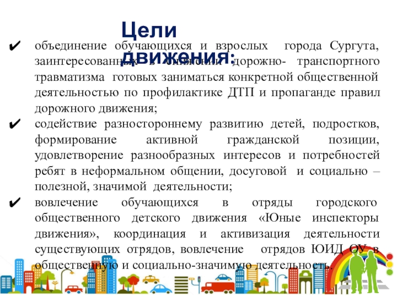 Содействие широкой популяризации детского движения «Юные инспекторы движения», привлечение в это движение новых членов, пропаганда идей безопасного поведения на улицах.