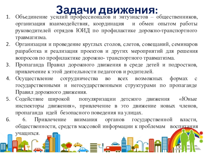 Пропаганда Правил дорожного движения в среде детей и подростков, привлечение к этой деятельности педагогов и родителей.