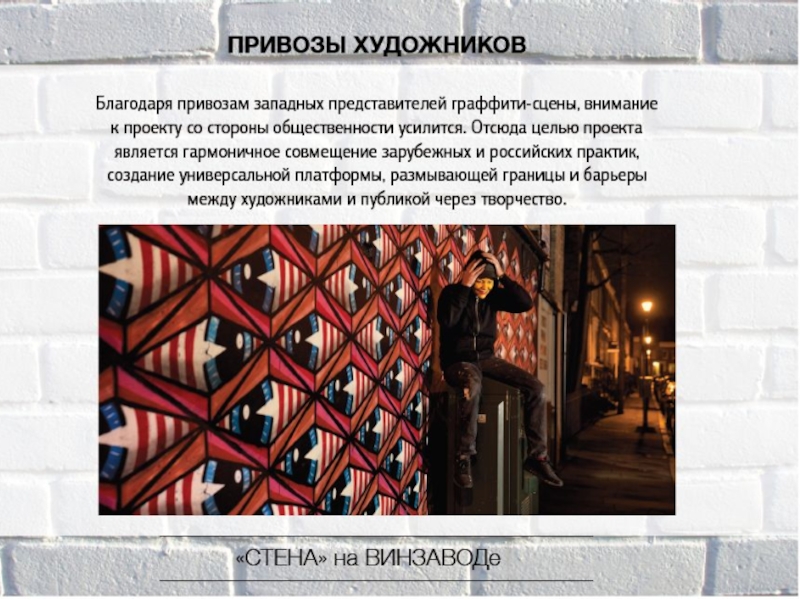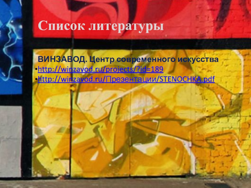 Список литературыhttp://winzavod.ru/projects/?id=189http://winzavod.ru/Презентации/STENOCHKA.pdfВИНЗАВОД. Центр современного искусства