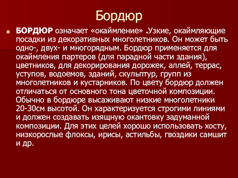 быть одно-, двух- и многорядным. Бордюр применяется для окаймления партеров (для парадной части здания), цветников, для декорирования дорожек, аллей, террас, уступов, водоемов, зданий, скульптур, групп из многолетников и кустарников. По цвету бордюр должен отличаться от основного тона цветочной композиции. Обычно в бордюре высаживают низкие многолетники 20-30см высотой. Он характеризуется строгими линиями и должен создавать изящную окантовку задуманной композиции. Для этих целей хорошо использовать хосту, низкорослые флоксы, ирисы, астильбы, гвоздики самшит и др.