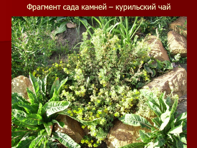 Слайд 28Фрагмент сада камней – курильский чай