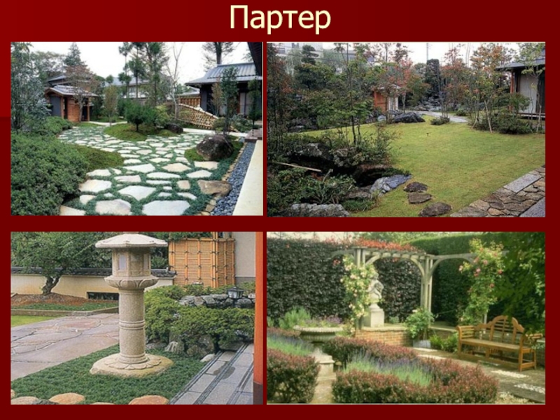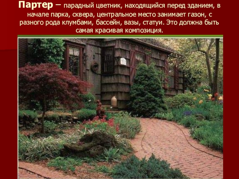 Слайд 22Партер – парадный цветник, находящийся перед зданием, в начале парка, сквера,