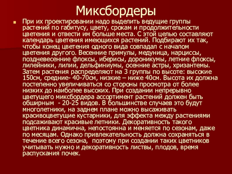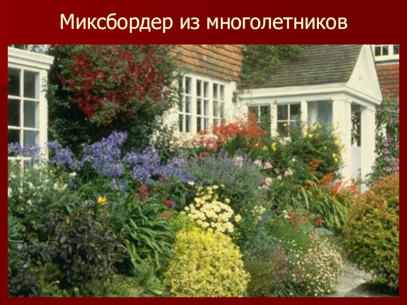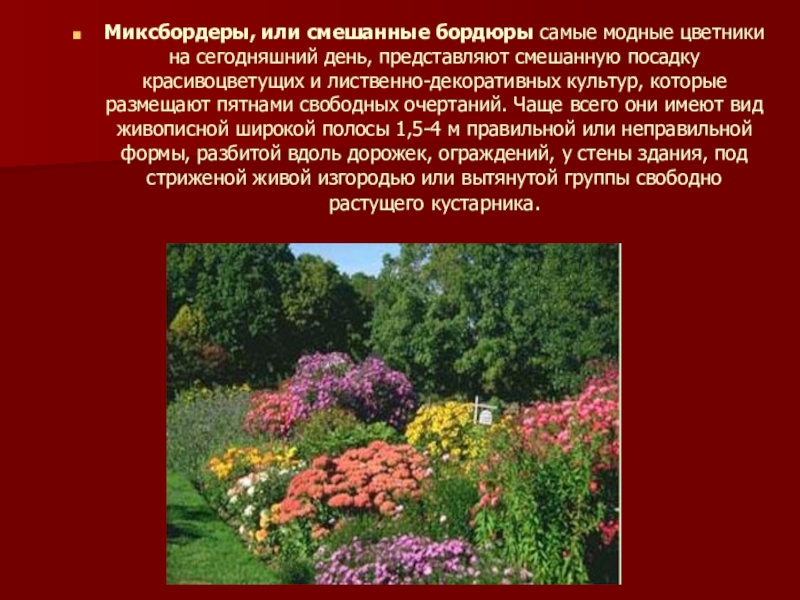Слайд 17Миксбордеры, или смешанные бордюры самые модные цветники на сегодняшний день, представляют