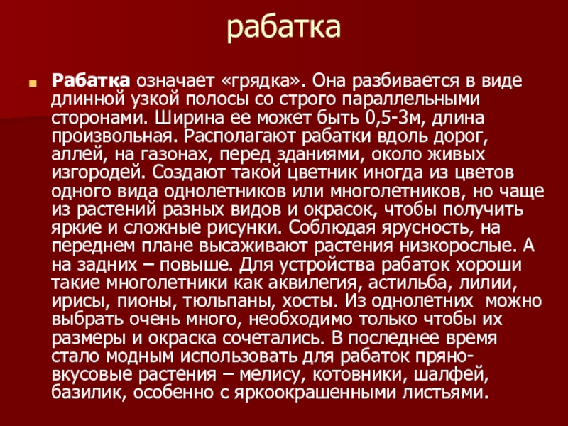 строго параллельными сторонами. Ширина ее может быть 0,5-3м, длина произвольная. Располагают рабатки вдоль дорог, аллей, на газонах, перед зданиями, около живых изгородей. Создают такой цветник иногда из цветов одного вида однолетников или многолетников, но чаще из растений разных видов и окрасок, чтобы получить яркие и сложные рисунки. Соблюдая ярусность, на переднем плане высаживают растения низкорослые. А на задних – повыше. Для устройства рабаток хороши такие многолетники как аквилегия, астильба, лилии, ирисы, пионы, тюльпаны, хосты. Из однолетних можно выбрать очень много, необходимо только чтобы их размеры и окраска сочетались. В последнее время стало модным использовать для рабаток пряно-вкусовые растения – мелису, котовники, шалфей, базилик, особенно с яркоокрашенными листьями.
