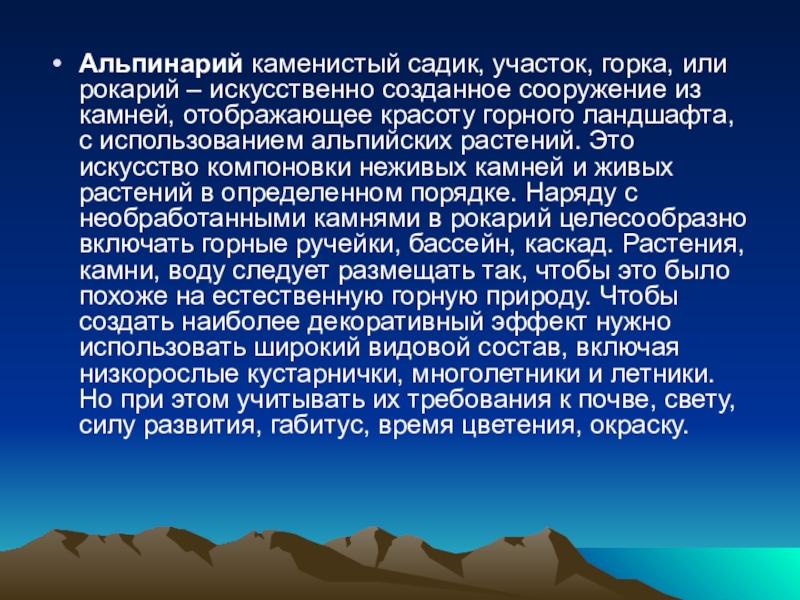 Слайд 26Альпинарий каменистый садик, участок, горка, или рокарий – искусственно созданное сооружение