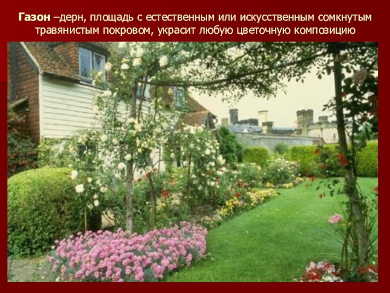 Слайд 15Газон –дерн, площадь с естественным или искусственным сомкнутым травянистым покровом, украсит