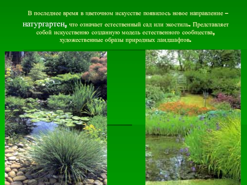 натургартен, что означает естественный сад или экостиль. Представляет собой искусственно созданную модель естественного сообщества, художественные образы природных ландшафтов.