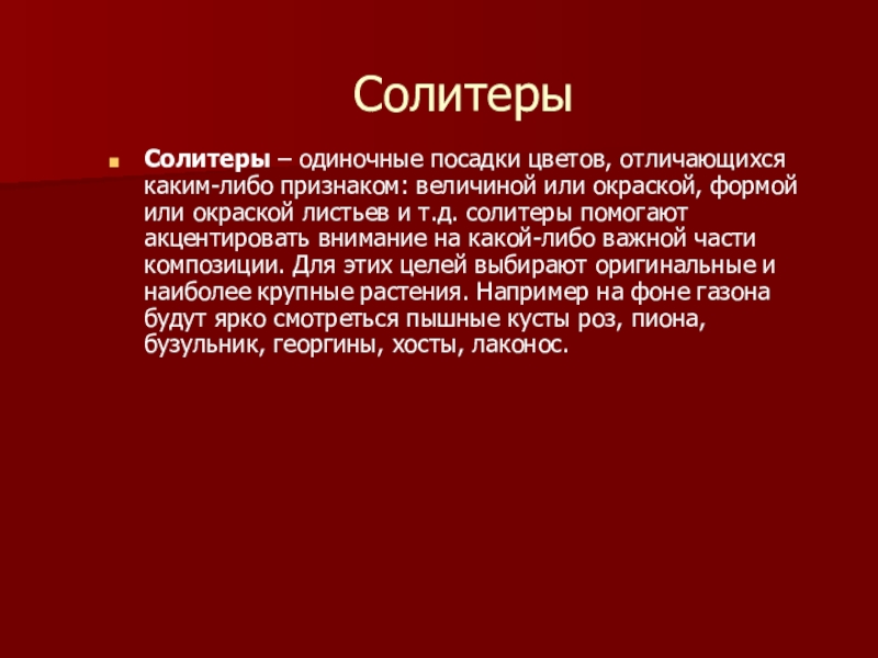 – одиночные посадки цветов, отличающихся каким-либо признаком: величиной или окраской, формой или окраской листьев и т.д. солитеры помогают акцентировать внимание на какой-либо важной части композиции. Для этих целей выбирают оригинальные и наиболее крупные растения. Например на фоне газона будут ярко смотреться пышные кусты роз, пиона, бузульник, георгины, хосты, лаконос.