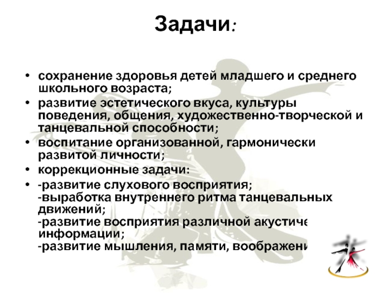Задачи: сохранение здоровья детей младшего и среднего школьного возраста;развитие эстетического вкуса, культуры поведения, общения, художественно-творческой и танцевальной