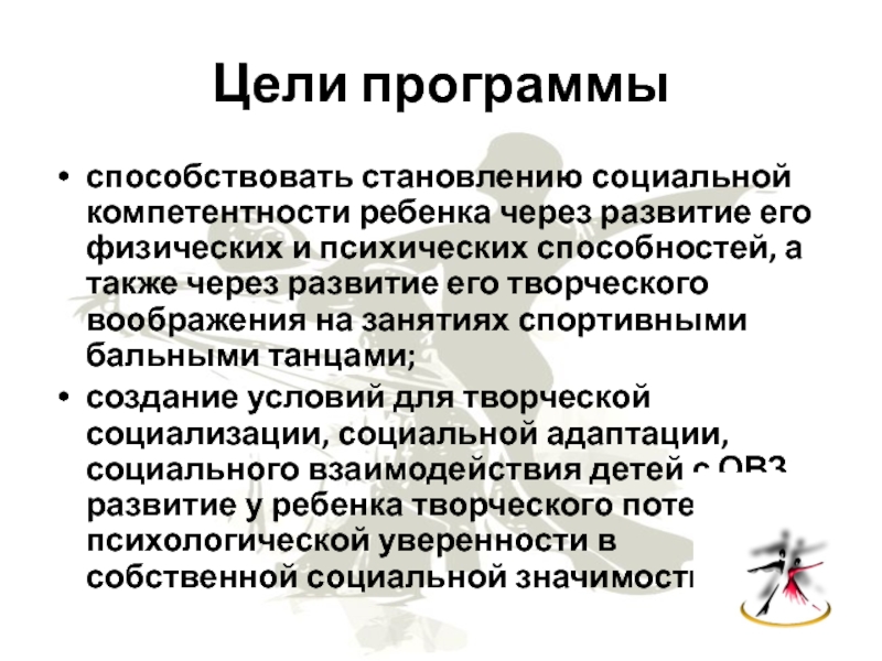 Цели программы способствовать становлению социальной компетентности ребенка через развитие его физических и психических способностей, а также через